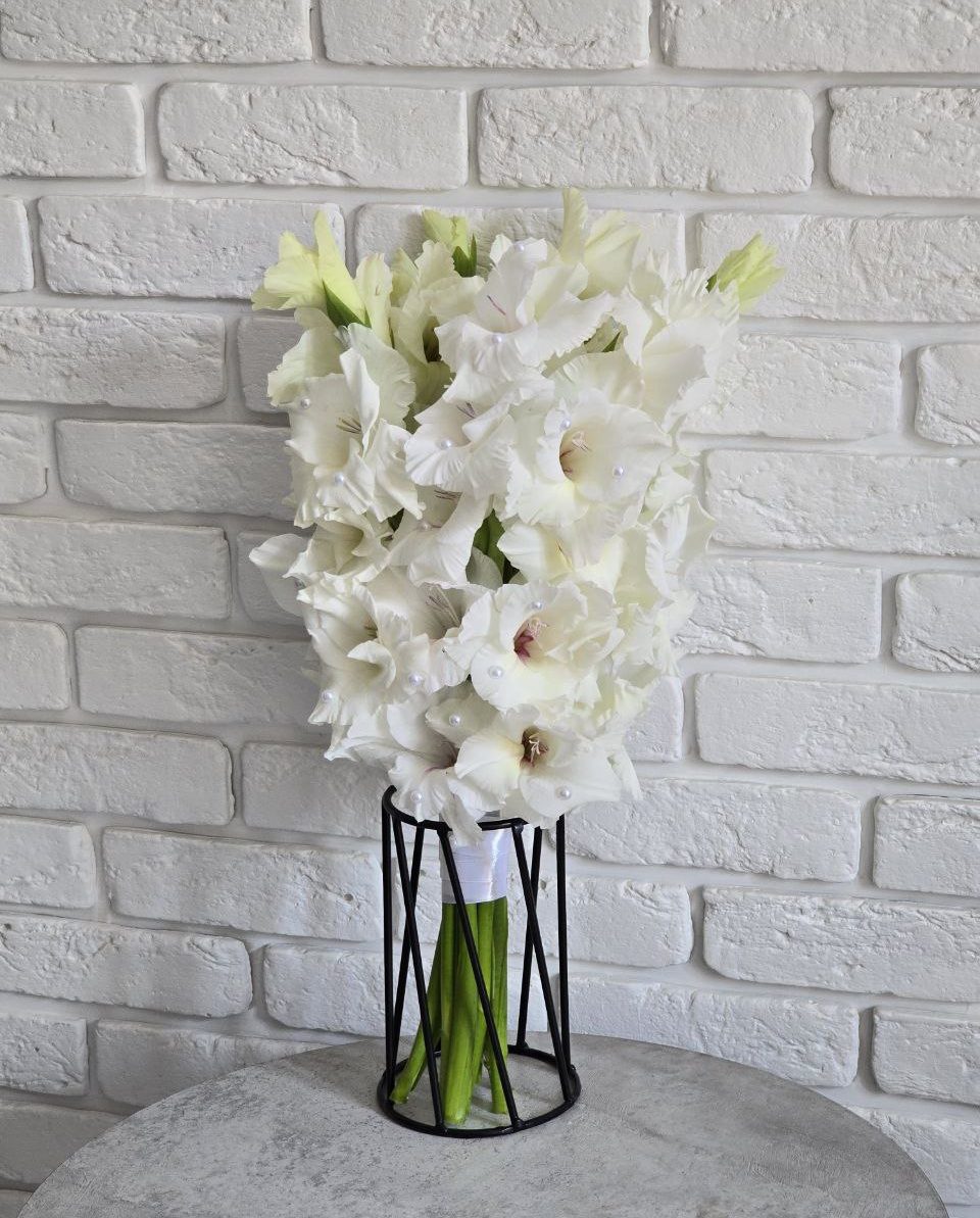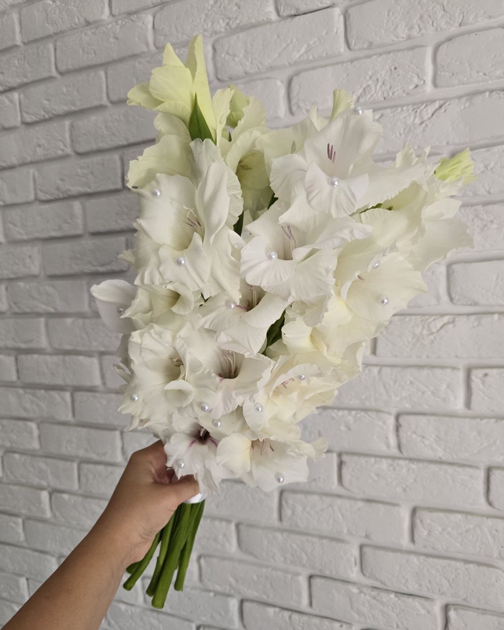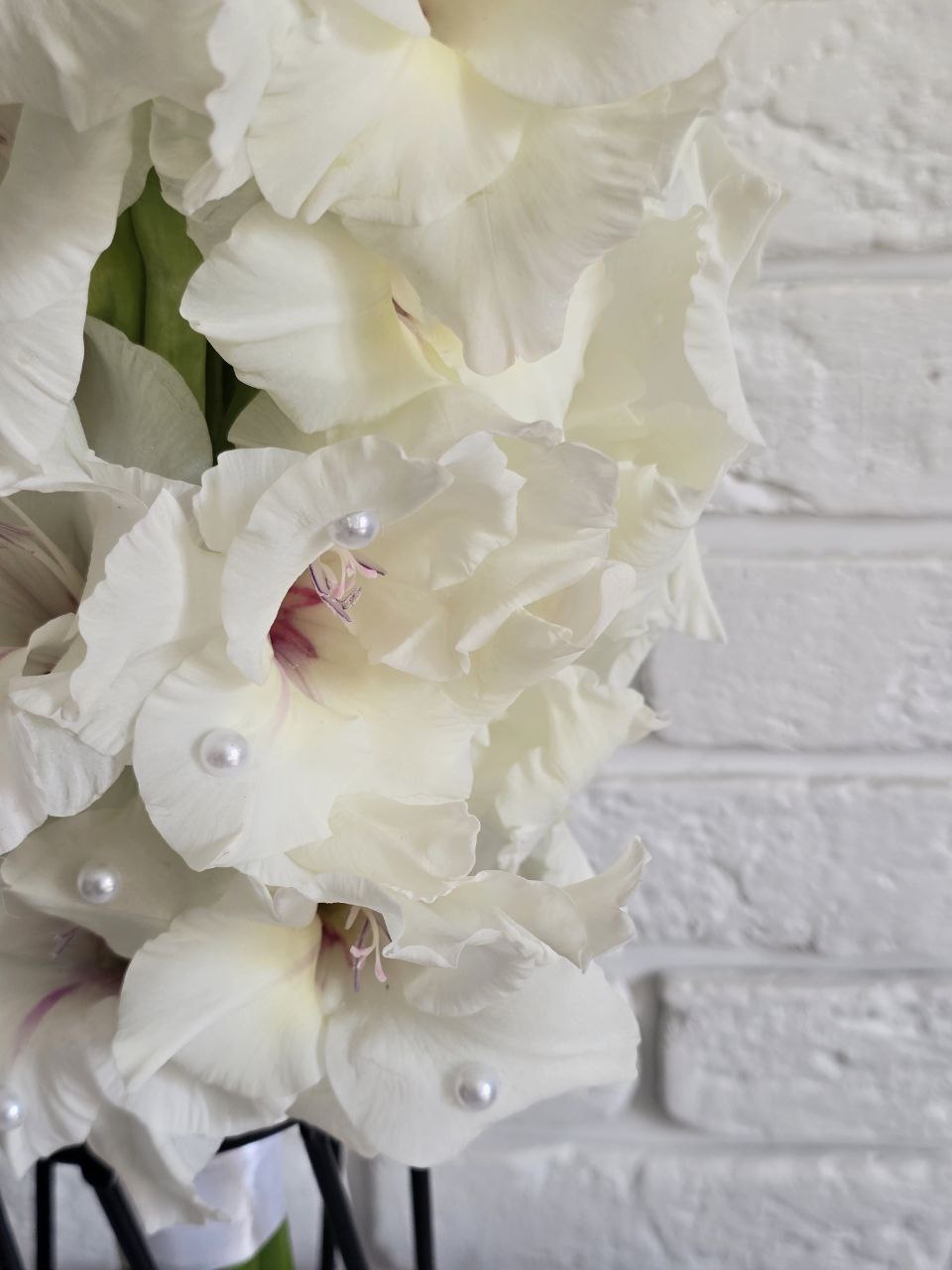 Описание: Элегантный и нежный букет из белоснежных гладиоусов, украшенных жемчугом