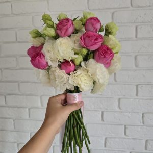 Описание: Изящный букет из белоснежных роз с нежным обрамлением эвкалипта, создающий элегантную и утонченную композицию.
